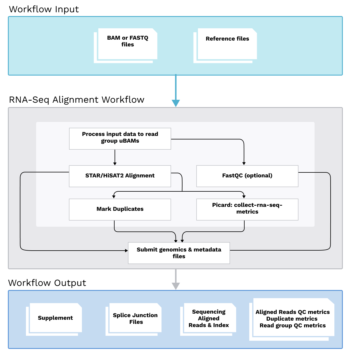 ARGO RNA-Seq Alignment workflow is a critical step in the RNA-Seq data analysis pipeline that involves mapping short RNA sequencing reads to a reference genome or transcriptome. The workflow accepts raw sequencing data in both FASTQ and BAM (aligned or unaligned) format, performs both STAR and HISAT2 alignments, and produces aligned reads in both genome and transcript coordinates, splice junctions and alignment QC reports.